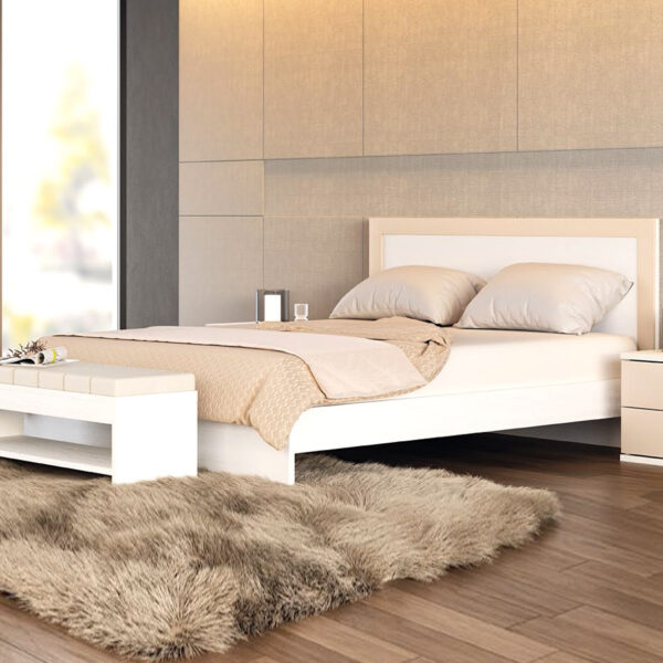 Cama de Casal em laminado Branco e Sahara, composto pelos seguintes móveis: