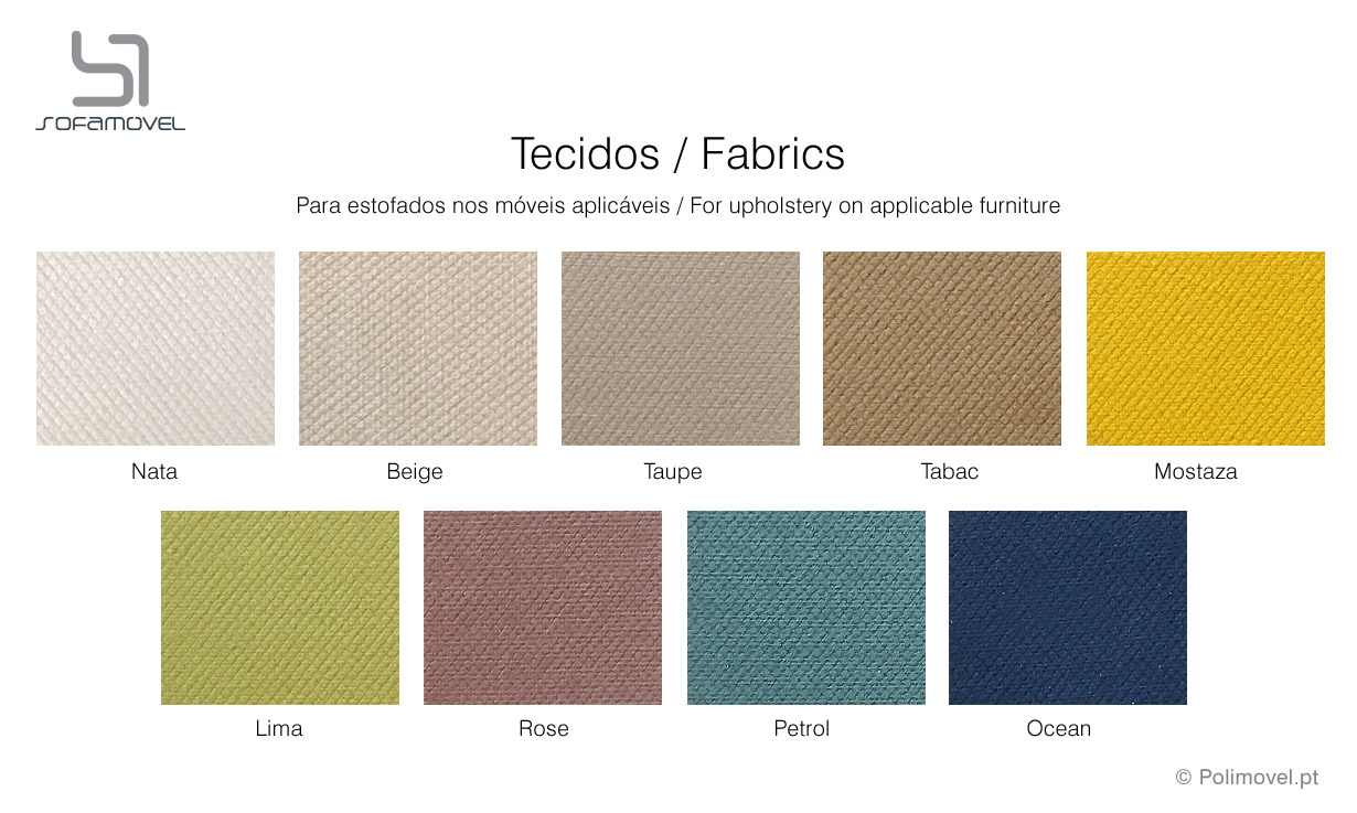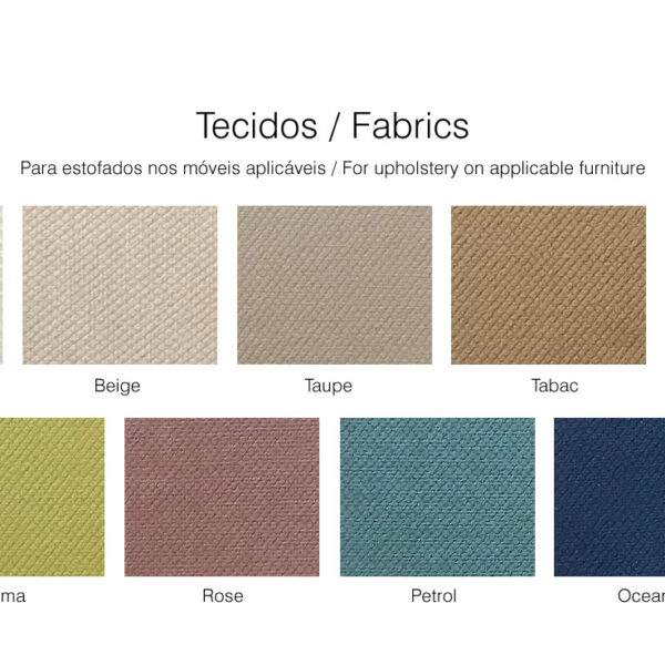 - Tecidos, aplicáveis à cabeceira e ao cadeirão: Nata, Beige, Taupe, Tabac, Lima, Rose, Petrol e Ocean.