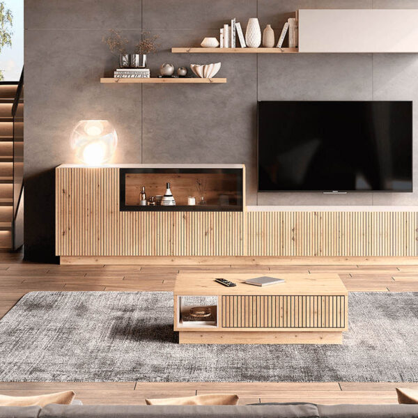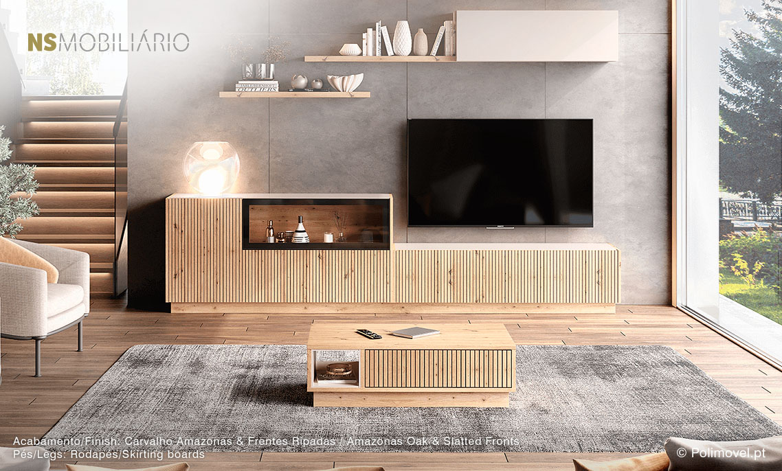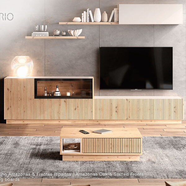 Acabamento em Carvalho Amazonas, com 3 portas, frentes ripadas, tampo em pérola suave e rodapé.