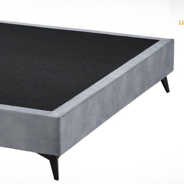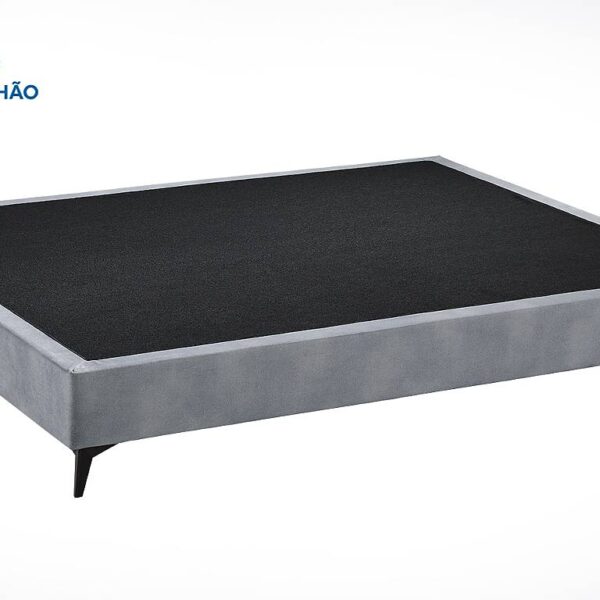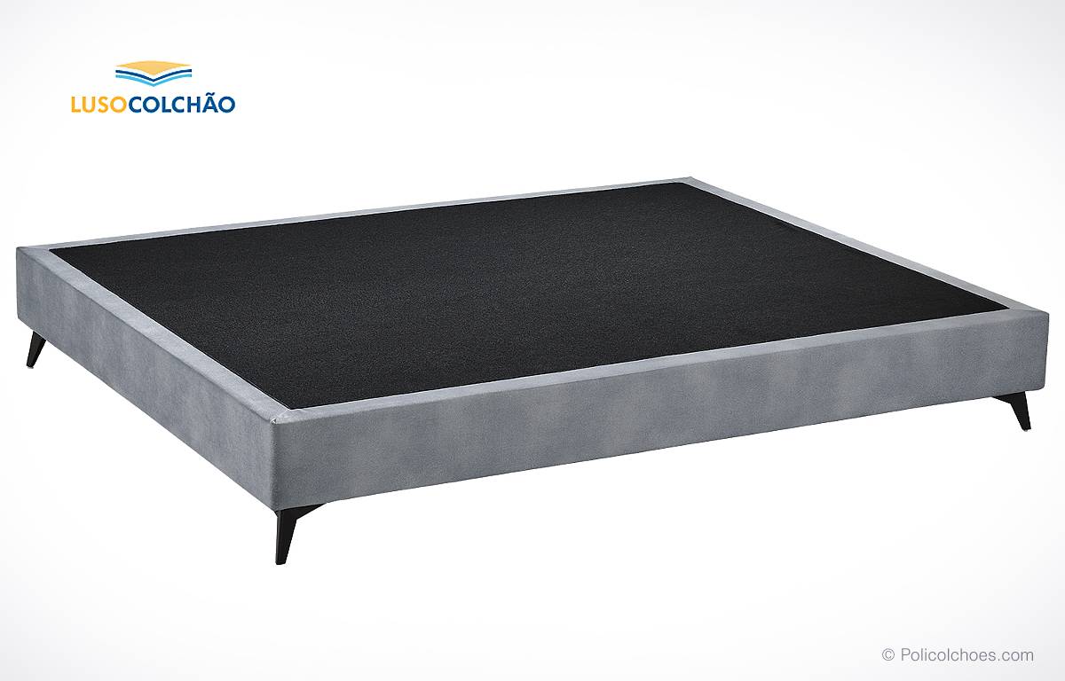 Base de cama fixa com estrutura metálica, tampo em MDF, estofado com revestimento à escolha e cerca de 31cm de altura.